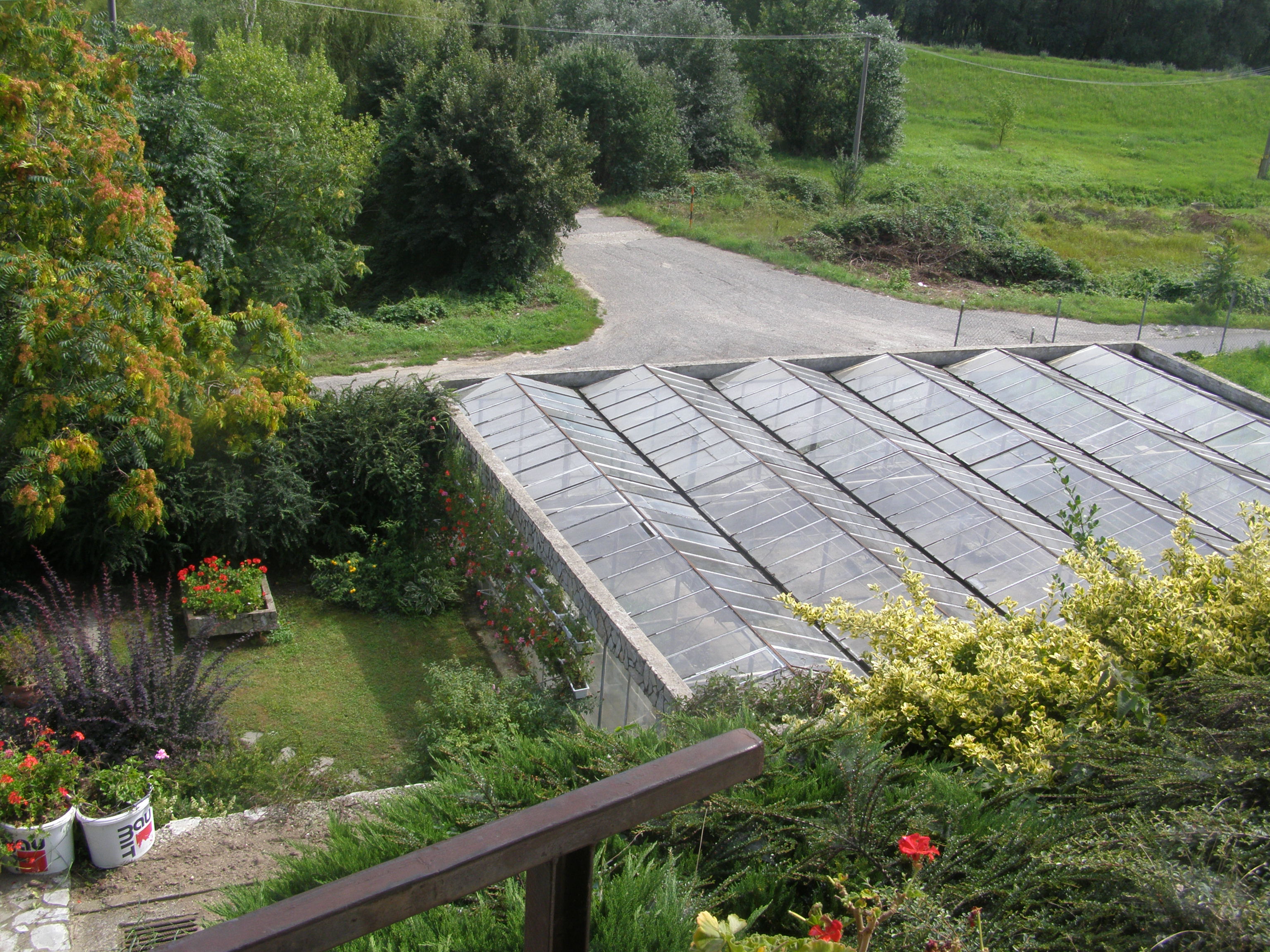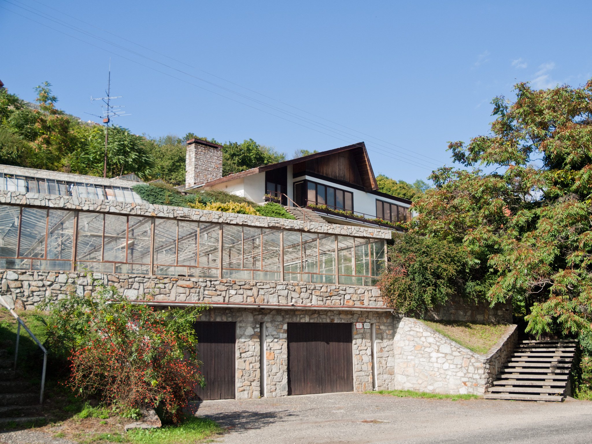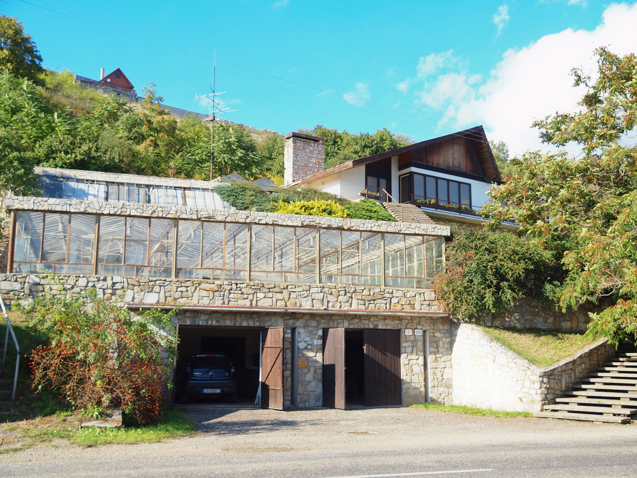 A garázsok tetején levő 93 nm-es üvegház a közút felől, külső lépcsőn is megközelíthető.